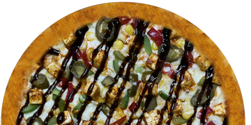 Golden corn, capsicum, red paprika, jalapenos, paneer, and Barbecue sauce with cheese blend